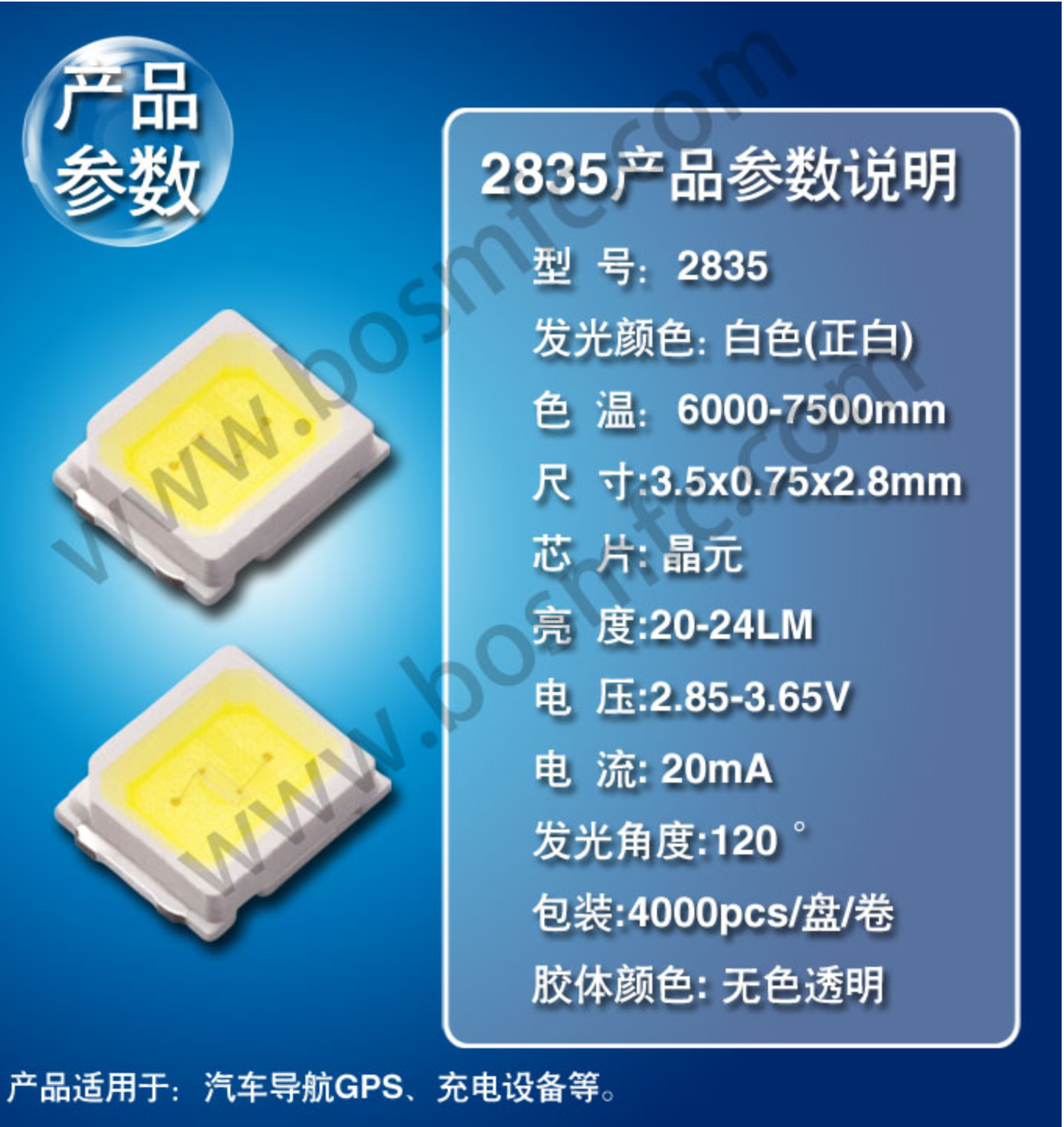 2835貼片LED燈珠尺寸:2.8*3.5*0.6-0.8mm;2835LED顏色分別有:2835紫光燈珠、2835藍(lán)光燈珠、2835綠光燈珠、2835橙光燈珠、2835黃光燈珠、2835紅光燈珠、2835深紅光燈珠、2835遠(yuǎn)紅光燈珠、2835紅外光燈珠等等??蛇x顏色:紫光、藍(lán)光、綠光、橙光、黃光、紅光、深紅、遠(yuǎn)紅、紅外??蛇x燈珠封裝支架:PCT/PPA;可選品牌芯片:三安、科銳cree原裝、晶元。功率:1W/0.5W/0.2W,電壓:3V/6V/9V。使用壽命:8年到10年。