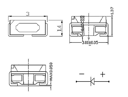什么是3014側(cè)發(fā)光呢?一般來說,LED硬條燈按尺寸大小、燈數(shù)、色溫、亮度(cd--坎德拉)、發(fā)光角度、電壓來標(biāo)示全稱型號。所說的3014、只是表明LED尺寸大小的行業(yè)簡稱,即:3014表示LED元件的長度是3.0mm,寬度是1.4mm;3014側(cè)發(fā)光尺寸圖如下: