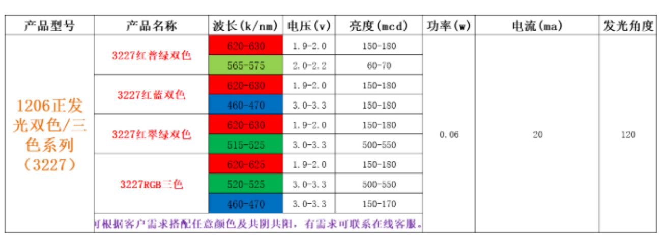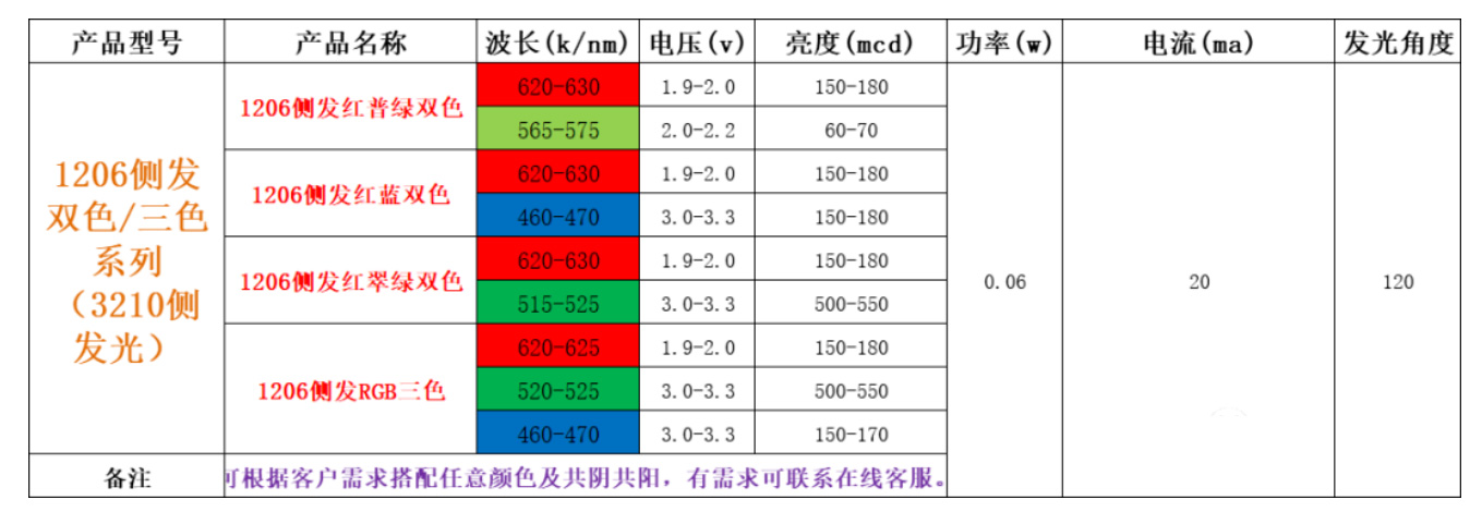 1206側(cè)發(fā)燈珠雙色、三色RGB參數(shù):
