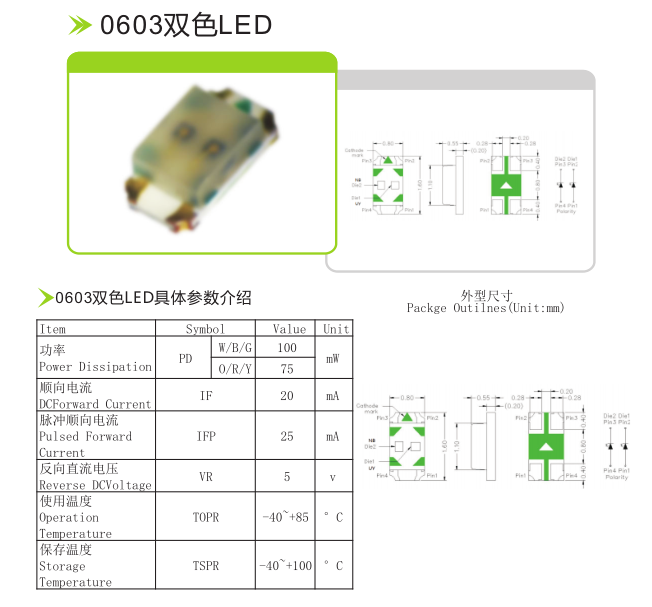 產(chǎn)品型號(hào):0603紅白雙色LED